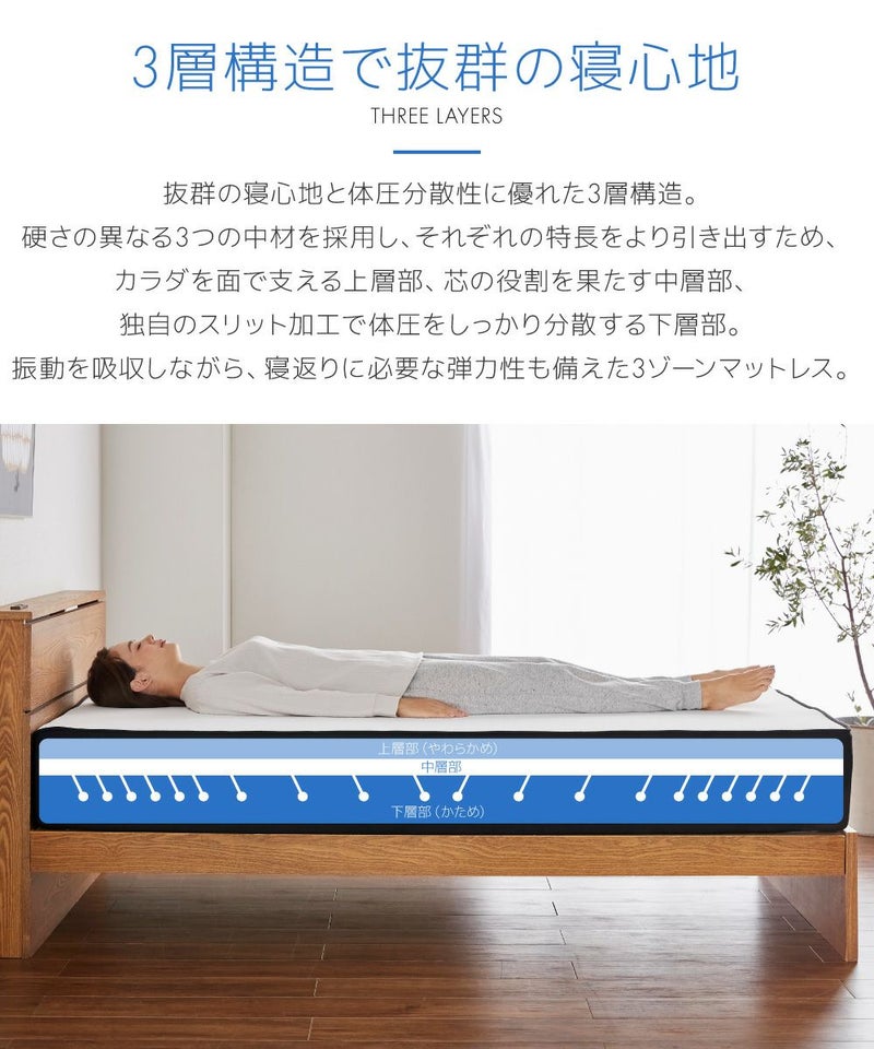 体圧分散性に優れた3層構造で、振動を吸収しながら寝返りに必要な弾力性も備えた3ゾーン高反発マットレス。最高の目覚めから1日が始まる、1日のスタートへのSwitch。
