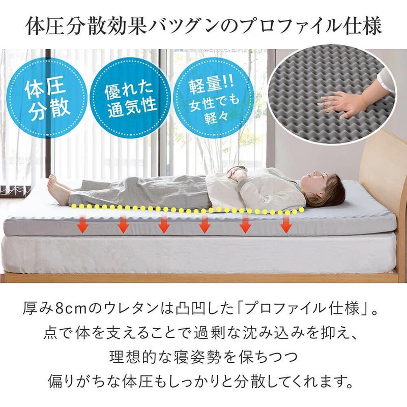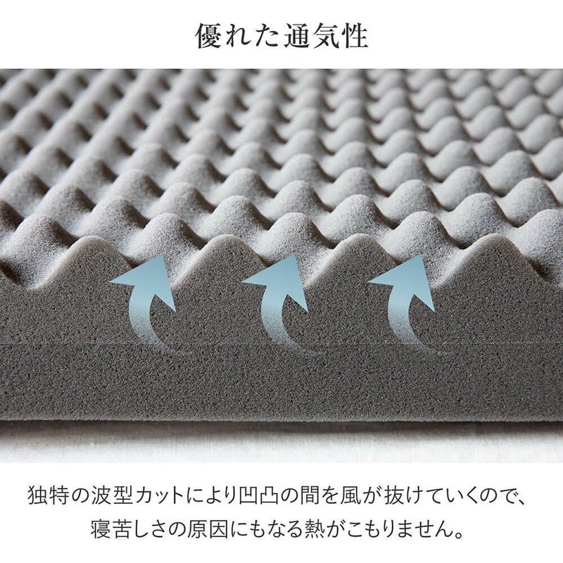 波型カットのプロファイル加工を施した高密度ウレタンにより、しっかりと体圧分散を行い、理想の睡眠姿勢を整えます。敷布団としてはもちろん、マットレスの上に重ねて寝心地改善のためのトッパーとしてもご使用いただけます。