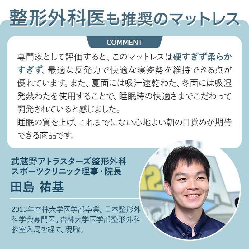 坐骨神経痛がひどく、良いマットレスを探していました。引っ越しを期にベッドの買い替えを検討中、こちらのマットレスを初めて知りました。今までは、某メーカーの高額なマットレスを使っていましたが、特に腰痛が良くなることもありませんでした。注文してすぐに届いたので、引っ越し後すぐに使うことができました。フローリングでフレームなしで使っていますが、初日から腰が楽になりました。寝返りがうてているのか、これまでよりも全身が楽になりました。お値段もかなりお手頃で、最初に検討していたメーカーの商品よりも半額くらいお安く購入できたので引っ越しで何かとお金が出ていく中、とても助かりました。個人差はあるでしょうが、痩せ型の人には向いているかもしれません。リピート確定なので、ぜひ作り続けて欲しいと願っています。有り難うございました♪