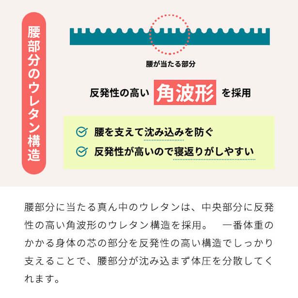 体重のかかる腰やお尻部分には、負担を極力軽減するために硬度の高いウレタン構造を採用しています。一方、肩や足部分には柔軟性の高いウレタン構造を採用しており、やさしく包み込むフィット感と寝返りのしやすさを実現しています。