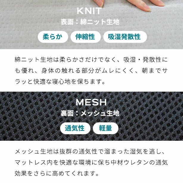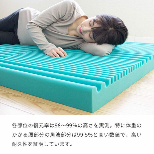 体圧分散性に優れ、寝返りが打ちやすくなるため、寝ている間の身体への負担を軽減し、軽やかな寝心地となっています。