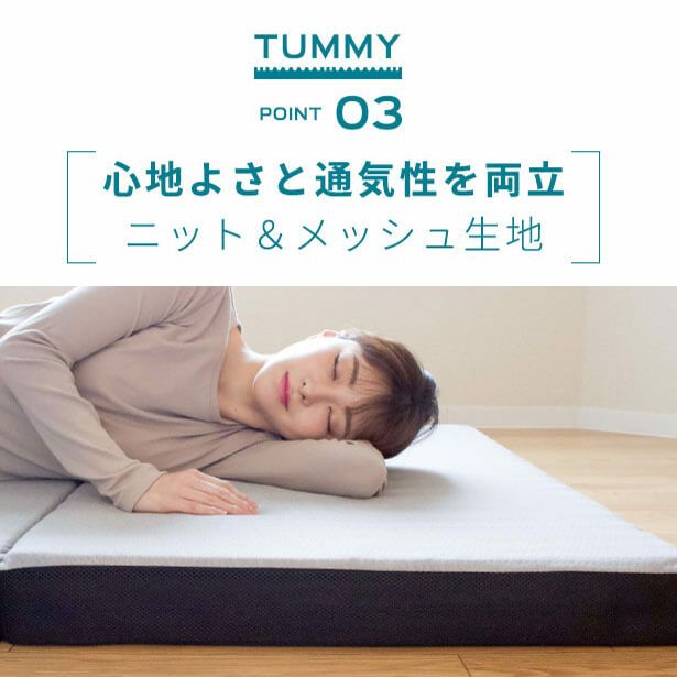 「Tummy(タミー)」は、理想的な寝姿勢を実現するために、身体の部位ごとにウレタンの硬度を変えた横寝促進三つ折りマットレスです。