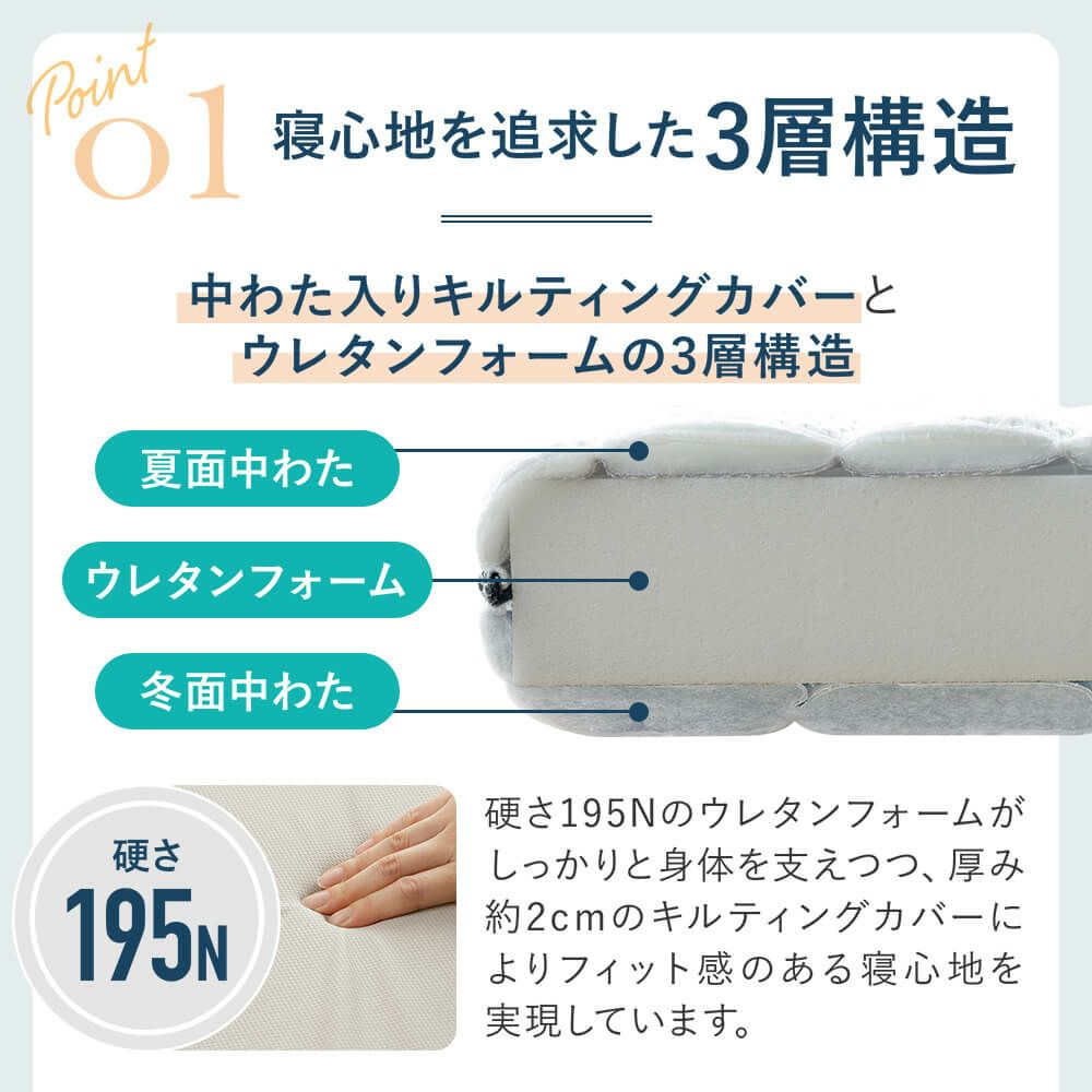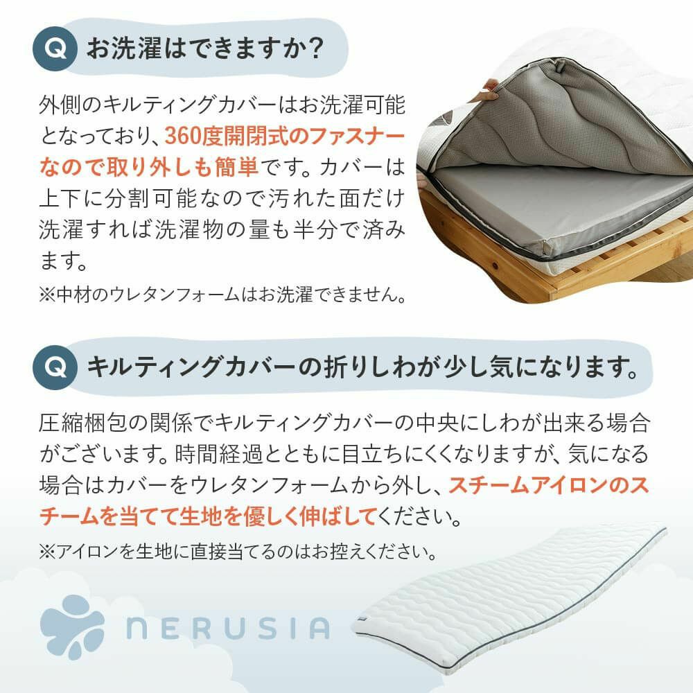 「NERUSIA(ネルシア)高弾性ウレタンマットレス」は「寝る幸せをあなたへ」というコンセプトのもと、50年以上の歴史を持つ寝具専門店で働くスタッフがお金を出して自分で購入したいものを作りたいという想いから生まれたビーナスベッドの完全オリジナルマットレスです。硬めのウレタンフォームがしっかりと身体を支えつつ、厚み2cmの中綿入りキルティングカバーによりフィット感のある寝心地を実現しています。また、業界トップクラスの反発力73%の高弾性ウレタンが自然な寝返りをサポートしてくれるため、肩こりや腰痛、寝起きの疲れなどのお悩みをお持ちの方にもおすすめです。キルティングカバーは夏面(吸汗速乾わた使用)と冬面(吸湿発熱わた使用)に分かれているため、1年中快適にご使用いただけます。防ダニ・抗菌・防臭加工を施しており、耐久性も高く、ロール状に三つ折りが可能など、マットレスに欲しい機能を全て詰め込んだ高品質・高機能マットレスに仕上がっています。圧縮梱包でお届けしますので、搬入の心配もいりません。
