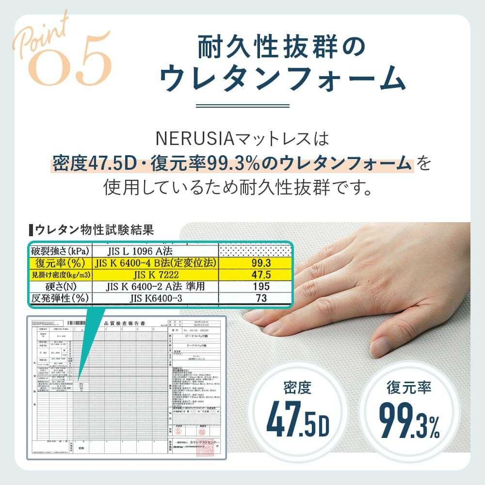 高弾性ウレタンフォーム(密度47.5D / 反発力73% / 復元率99.3% / 硬さ195N)