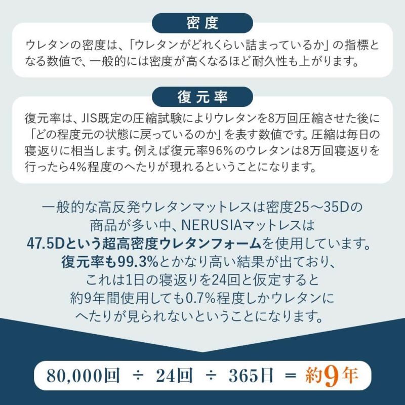 高弾性ウレタンフォーム(密度47.5D / 反発力73% / 復元率99.3% / 硬さ195N)