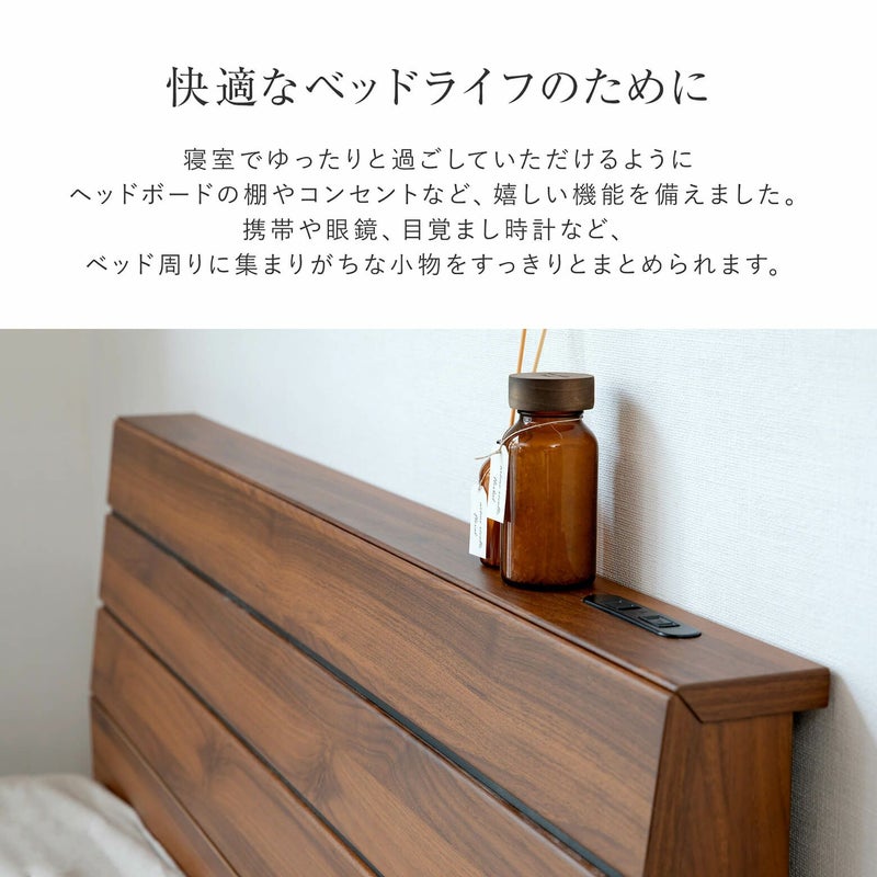 どんなお部屋にも馴染む、三枚板デザインのベッドフレームです。ヘッドボード上部には、小物置きのスペースがあり、2口コンセントが付いています。表面は塩ビ素材ですので、キズや汚れに強いのもポイントです。