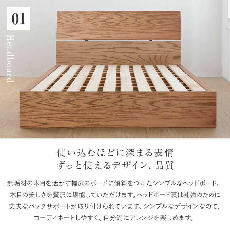 オーク無垢材に、ブラウン色のオイル塗装を施すことでより一層、力強い木目を表現した当店オリジナルベッド。深い木目の美しさが際立つシンプルなデザイン。職人の丁寧な仕事が光る、安心の品質。2台並べても、隙間なくご使用いただけます。国産ベッド。国産寝具。
