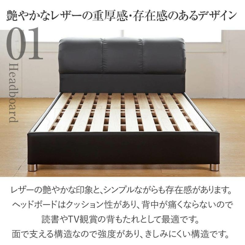国内自社工場生産の日本製レザーベッド。カジュアルでおしゃれなデザインが人気。読書に、テレビ鑑賞に、クッション性のある背もたれがあなたの体をしっかり支えてくれます。通気性のよいスノコを使用。ロングサイズもあります。ビーナスベッドオリジナル商品。シングルサイズのベッドを2台並べて使用すると、キングサイズのベッドとしてご使用できます。