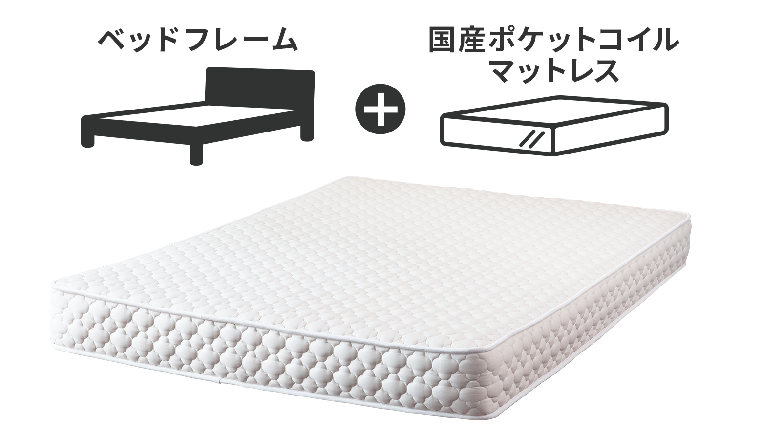 お選びいただいたベッドフレームと同じサイズのマットレスがついてきます。