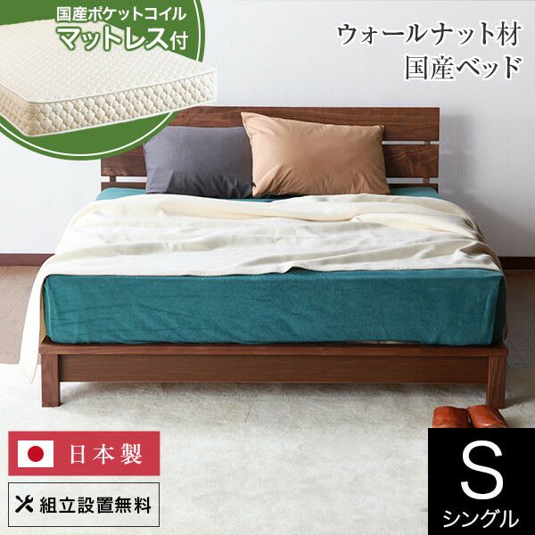 ウォールナットの落ち着きあるブラウンカラーを、軽やかな印象を与えるデザインで表現した木製ベッド。ヘッドボードのスリットがアクセントとなっています。無垢材と突板の両方を使用し、国内工場で1台ずつ丁寧に仕上げました。価格・デザイン・品質すべてがバランス良いベッドです。