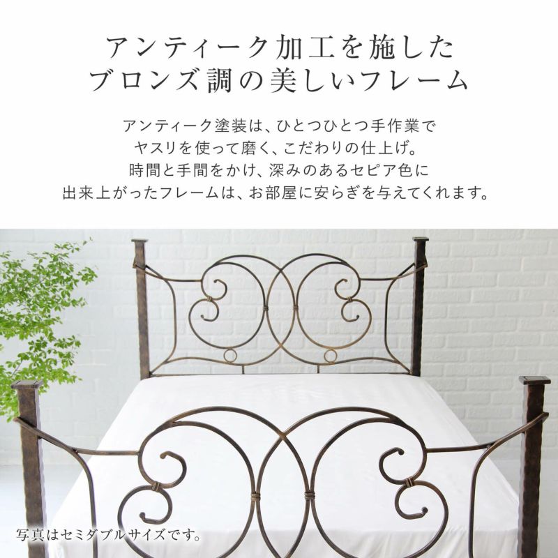 パイプベッドならではの、アラベスク(唐草模様)のような美しく繊細な曲線を描くアイアン製パイプベッド。ブロンズ調のアンティーク塗装は、ひとつひとつ手作業仕上げ。深みのあるセピア色のフレームがお部屋に安らぎを与えます。マットレスをのせる床板は、湿気が気にならないスリット仕様です。