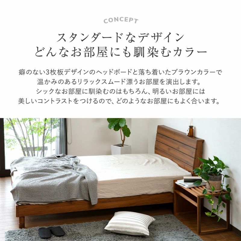 どんなお部屋にも馴染む、三枚板デザインのベッドフレームです。ヘッドボード上部には、小物置きのスペースがあり、2口コンセントが付いています。表面は塩ビ素材ですので、キズや汚れに強いのもポイントです。