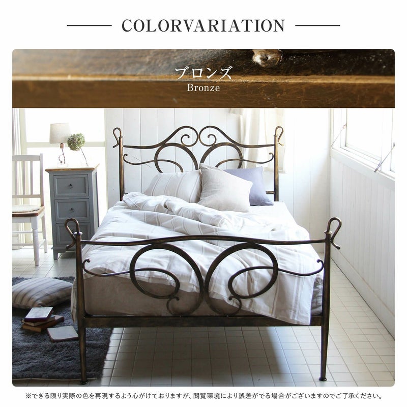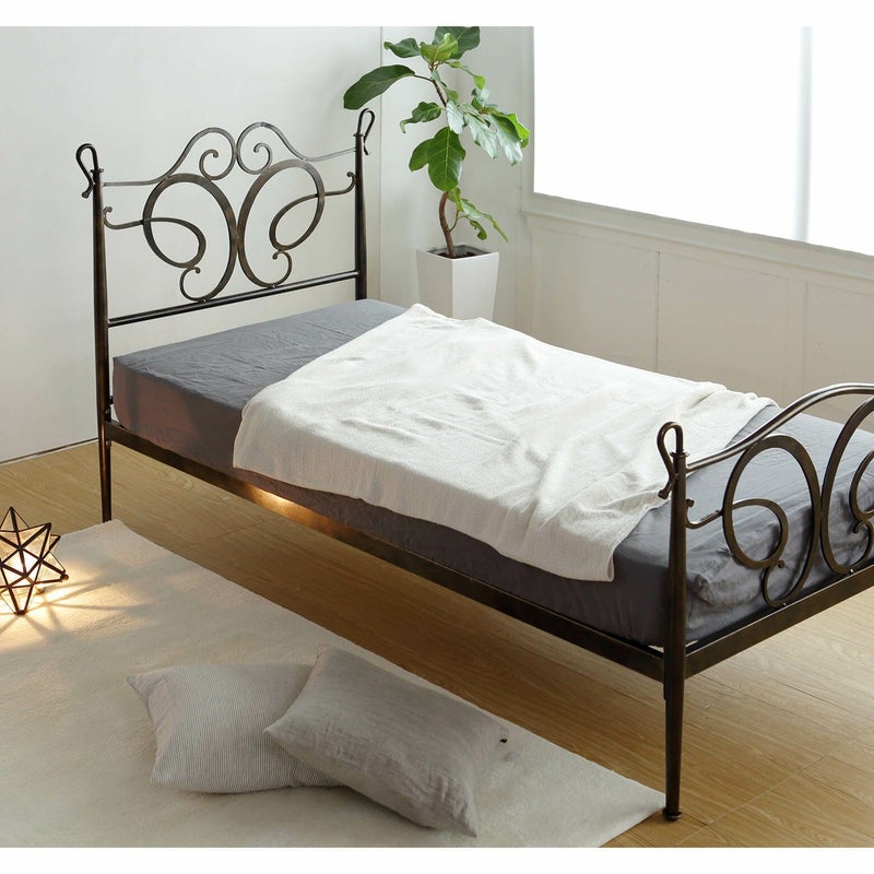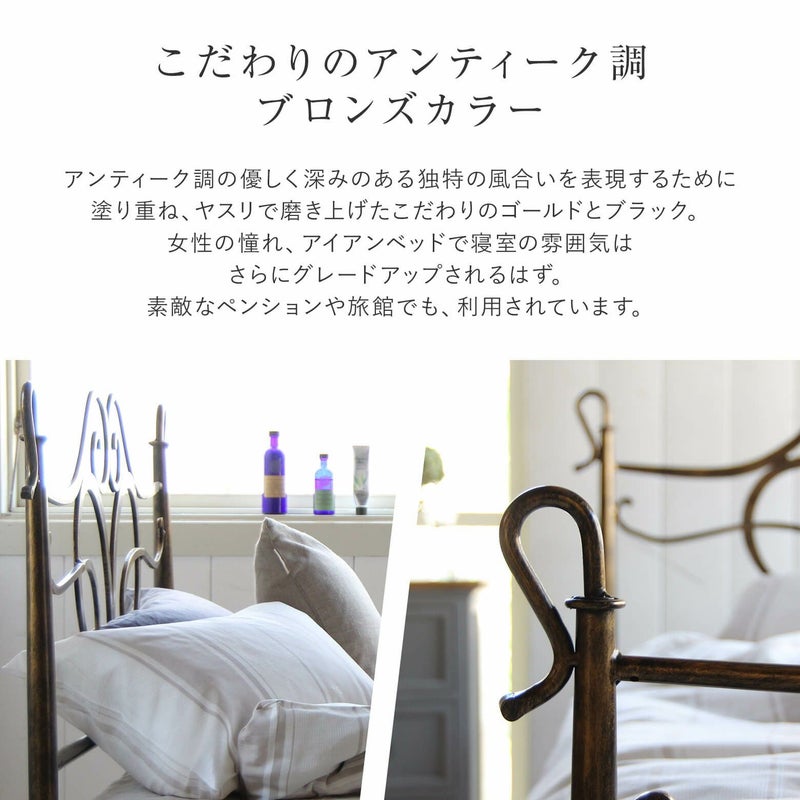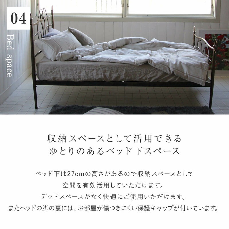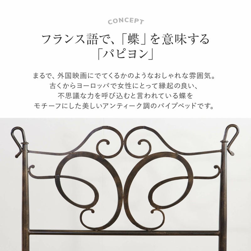 まるでパリのアパルトマンの寝室を思わせる、アンディーク調のアイアン製パイプベッド。その名の通り、蝶をモチーフにした装飾がヘッドボードに施され、女性らしい美しい曲線を描いています。ベッドフレームはアンティーク調の風合いに仕上げられ、おしゃれな雰囲気を際立たせます。マットレスをのせる床板は湿気が気にならないスリット仕様です。