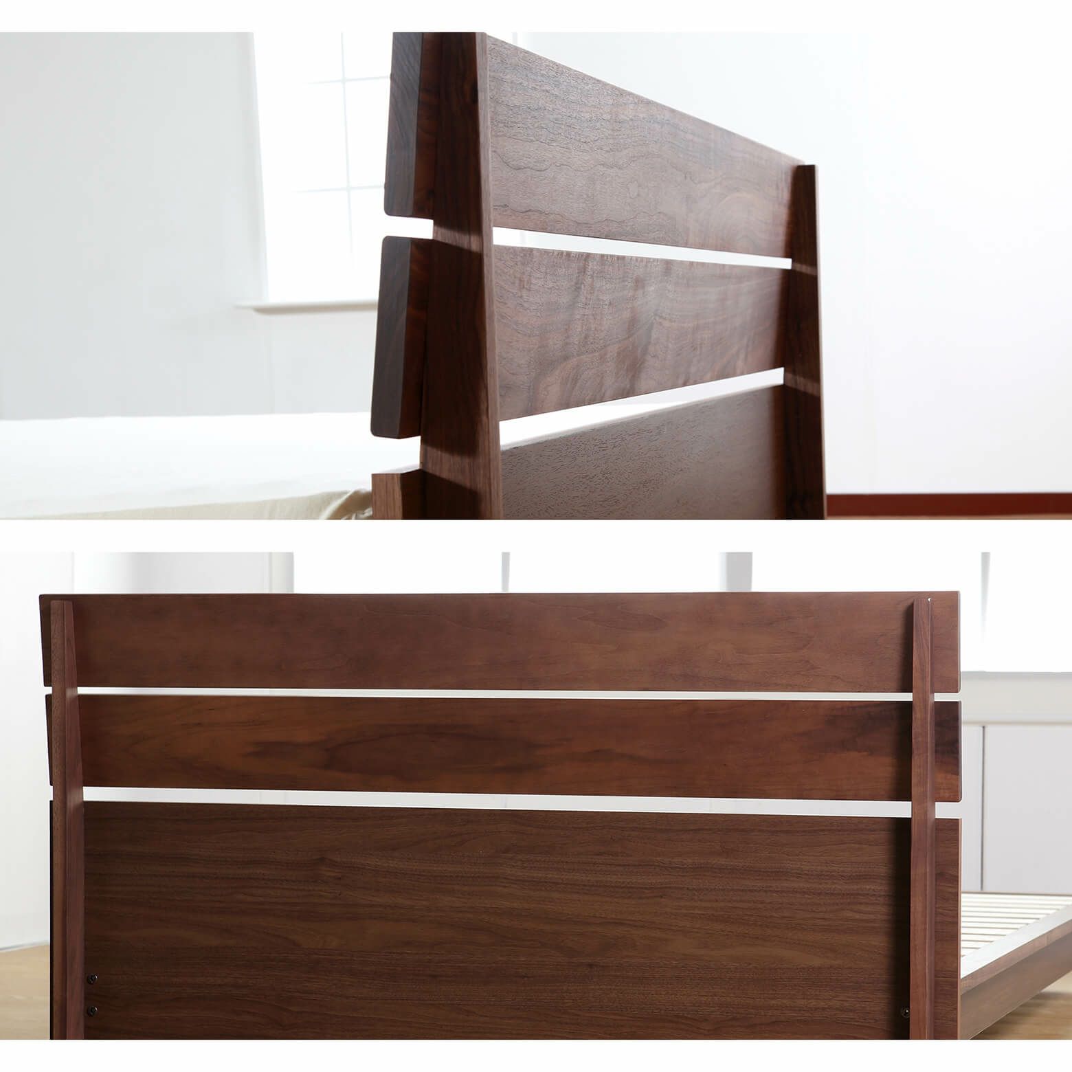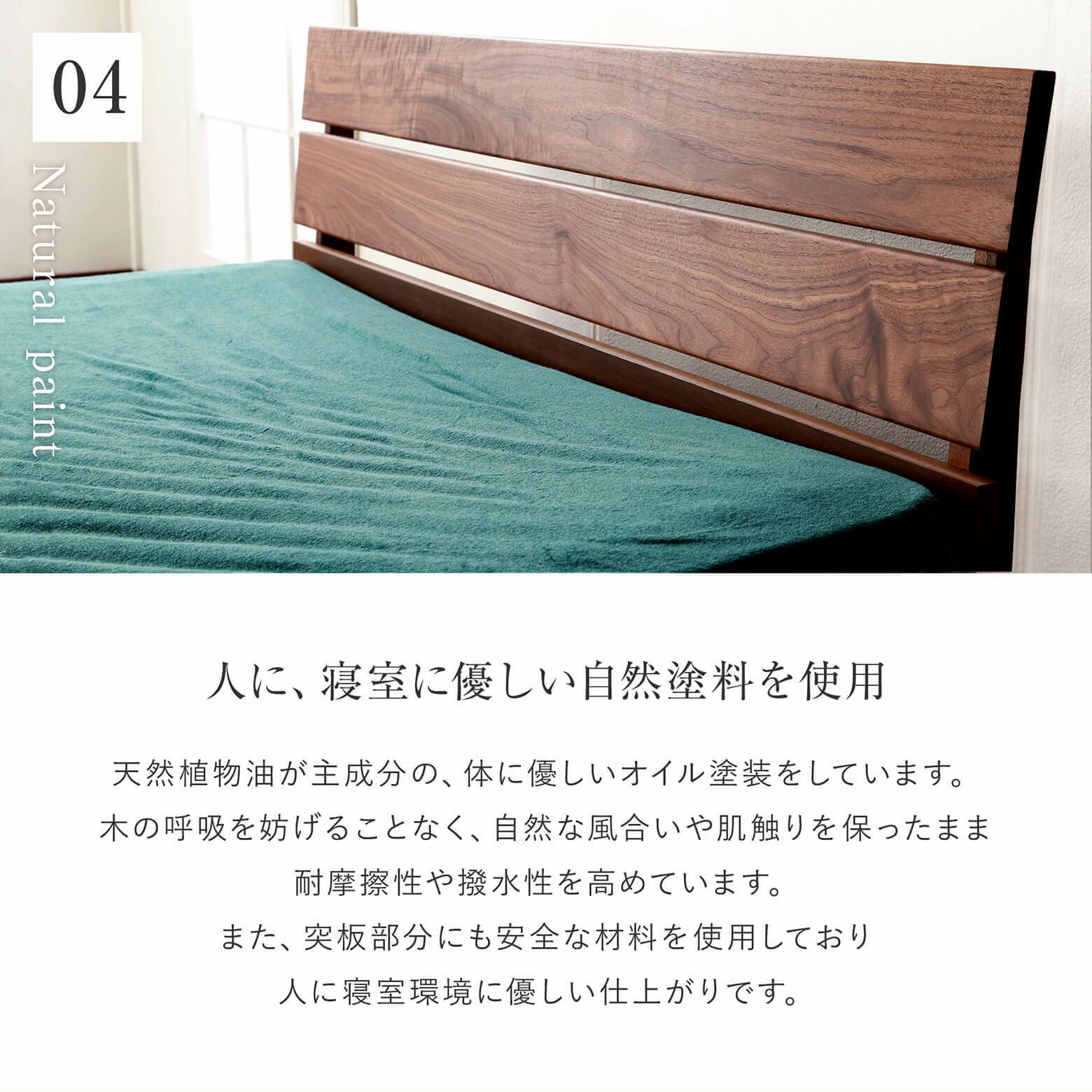 ウォールナットの落ち着きあるブラウンカラーを、軽やかな印象を与えるデザインで表現した木製ベッド。ヘッドボードのスリットがアクセントとなっています。無垢材と突板の両方を使用し、国内工場で1台ずつ丁寧に仕上げました。価格・デザイン・品質すべてがバランス良いベッドです。