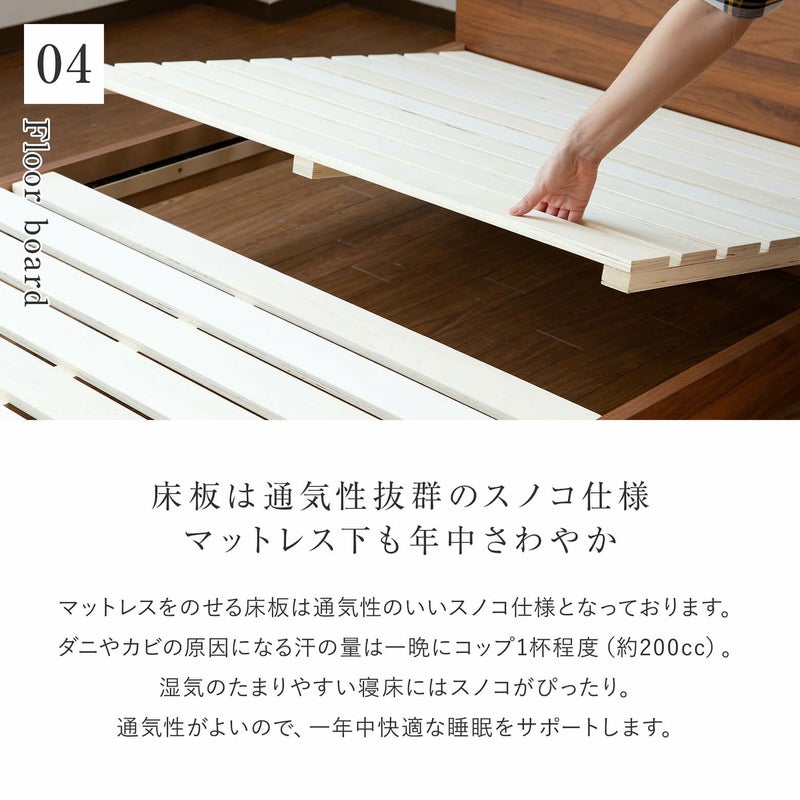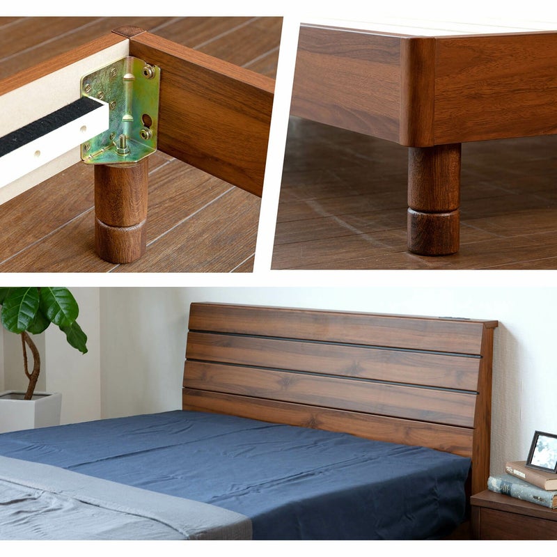 どんなお部屋にも馴染む、三枚板デザインのベッドフレームです。ヘッドボード上部には、小物置きのスペースがあり、2口コンセントが付いています。表面は塩ビ素材ですので、キズや汚れに強いのもポイントです。