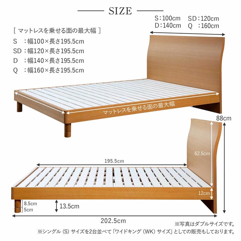ヘッドボードの曲線がエレガントな雰囲気を演出します。その曲線は見栄えだけでなく、もたれかかった時に背中のおうとつにぴったりフィットし、ベッドの上での読書やテレビ鑑賞に役立ちます。※この商品はシングルサイズを2台並べて「ワイドキングサイズ」として販売しています。1台ずつでの使用も可能です。