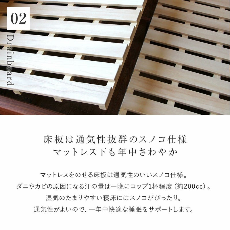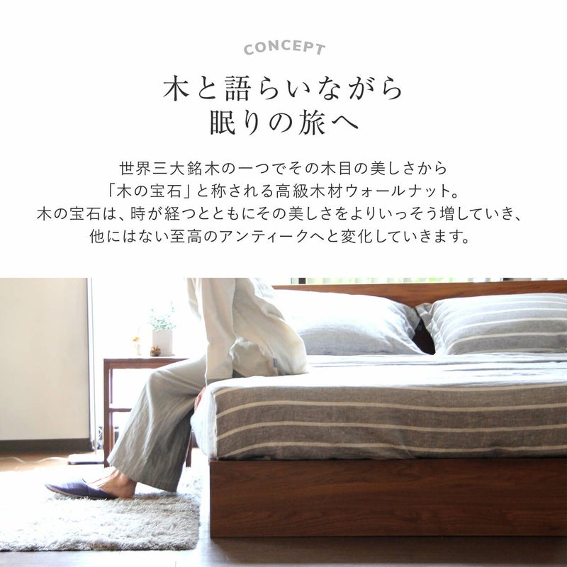 木目が美しいウォールナット材と、それそ際立たせるシンプルなパネル型のヘッドボード。オイル塗装で無垢の風合いを活かしました。職人の丁寧な仕事が光る、当店オリジナルのベッドです。2台並べても、隙間なくご使用いただけます。