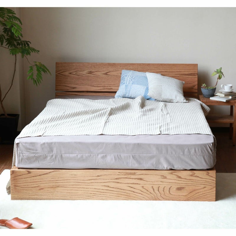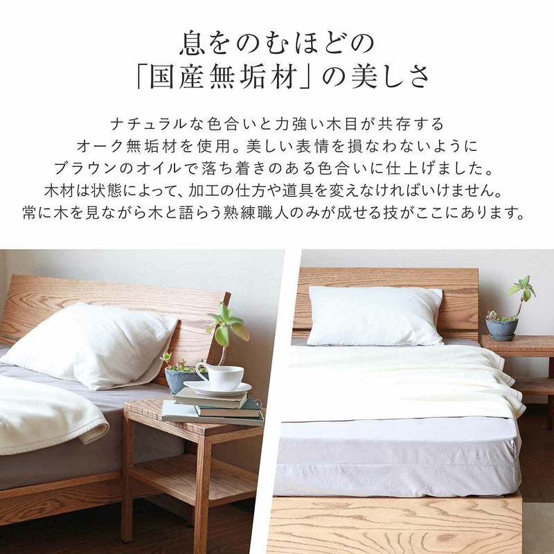オーク無垢材に、ブラウン色のオイル塗装を施すことでより一層、力強い木目を表現した当店オリジナルベッド。深い木目の美しさが際立つシンプルなデザイン。職人の丁寧な仕事が光る、安心の品質。2台並べても、隙間なくご使用いただけます。国産ベッド。国産寝具。