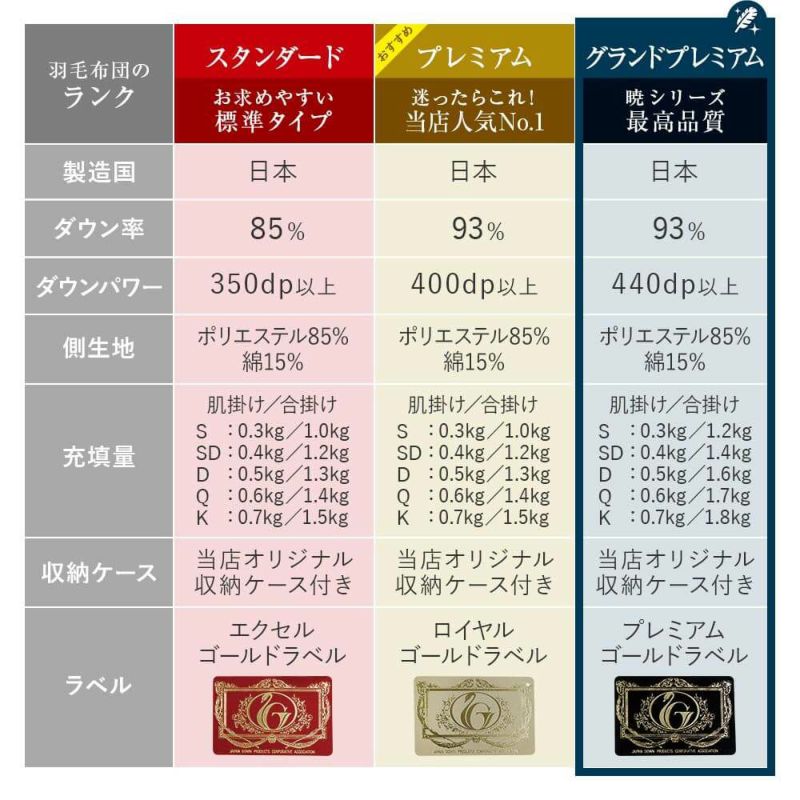 日本羽毛製品協同組合が定める最高級ランク「プレミアムゴールドラベル」を取得した、当店オリジナルの国産2枚合わせ羽毛布団です。合掛け布団と肌掛け布団を繋ぐジョイントホックも付属。季節に応じて使い分けいただけます。防臭、抗菌加工を施しており、安心安全にご使用いただけます。