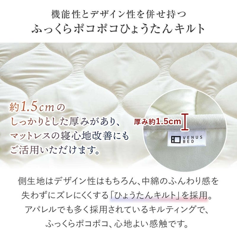 表面生地はピーチスキン調に加工し、柔らかくなめらかな肌触りに仕上げた当店オリジナルの国産ポリエステルベッドパッドです。抗菌、防臭、防ダニ機能付の中綿を使用しているため、安心安全にご使用いただけます。サイズ展開も豊富にご用意しております。