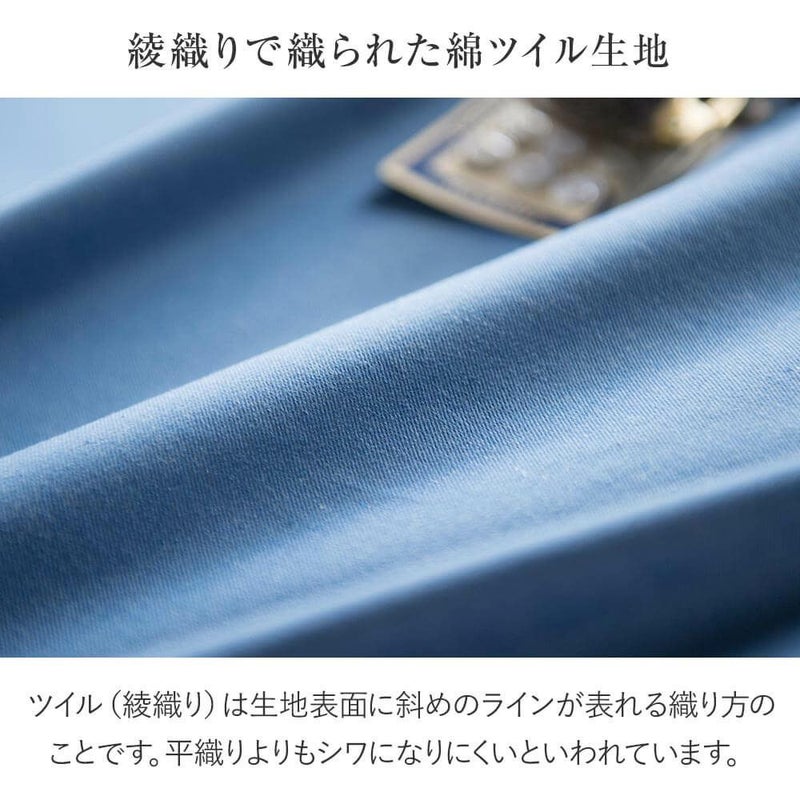 生地表面に斜めのラインが現れる「綾織り」で織られた綿100%のファブリックで、薄手でサラッとした肌ざわりと光沢が魅力です。