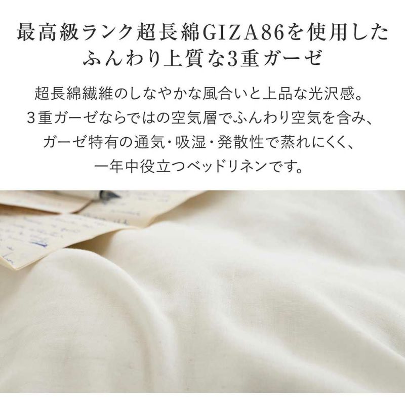 ファブリックの宝石と謳われる最高級ランクの「エジプト綿GIZA86(超長綿)」を使用。超細番手の60番の糸をふんわり3重ガーゼに織り上げました。お洗濯すると3重ガーゼの空気層にたっぷりと空気を含み、ふっくらボリュームアップします。素材にこだわった、ひと味違うガーゼの肌触りをお楽しみください。
