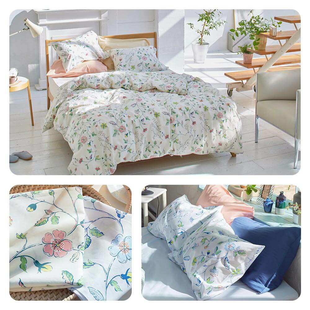 18世紀の英国の画集に出てきそうな草葉。エレガントさの中に可愛らしさを合わせ持った更紗風の花柄で寝室が優しい空気に包まれます。