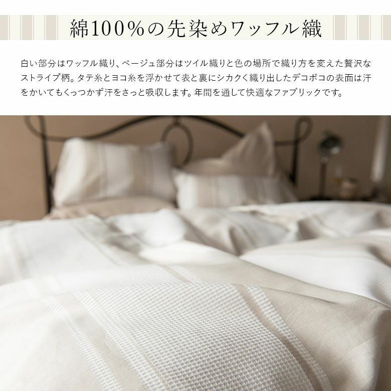 ワッフルとツイル織りを組み合わせたストライプの「Chic stripe(シックストライプ)」。上品でいて、肩ひじを張らない心地よい快適なファブリックです。デコボコの表面は、汗をかいてもベタっとくっつかず、汗をさっと吸収してくれます。夏場は清涼感、冬場は保温性があり、一年を通して、心地よく活躍してくれます。