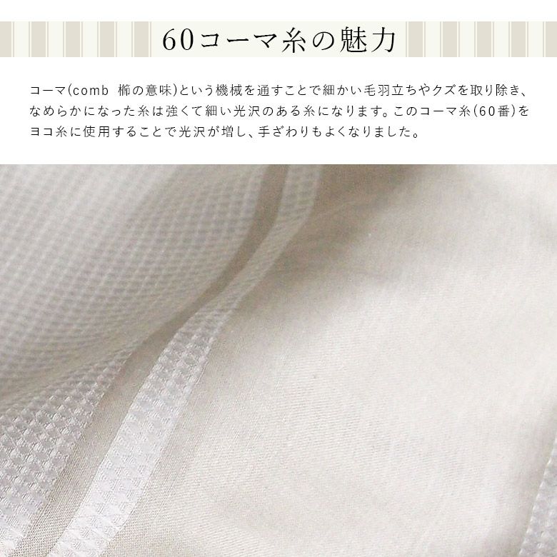 ワッフルとツイル織りを組み合わせたストライプの「Chic stripe(シックストライプ)」。上品でいて、肩ひじを張らない心地よい快適なファブリックです。デコボコの表面は、汗をかいてもベタっとくっつかず、汗をさっと吸収してくれます。夏場は清涼感、冬場は保温性があり、一年を通して、心地よく活躍してくれます。
