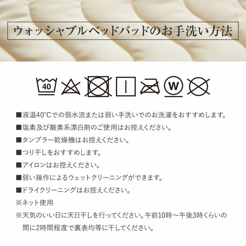ベッドパッドはサラッとした肌触りと、ふわっとした寝心地がたまらなく気持ちよいと大人気の「ウォッシャブルベッドパッド」。へたりにくく乾きが早いので、お洗濯も楽々!専用の洗濯ネットが付いるのも嬉しいポイントです。抗菌・防臭綿を使用しています。