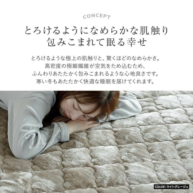 とろけるような極上の肌触りと、驚くほどのなめらかさ。高密度の極細繊維が空気をため込むため、ふんわりあたたかく包みこまれるような心地良さです。表生地と中綿のボリュームをアップする事で、さらに上質な寝心地とあたたかさに。中綿が抗菌防臭仕様なのも、うれしいポイントです。