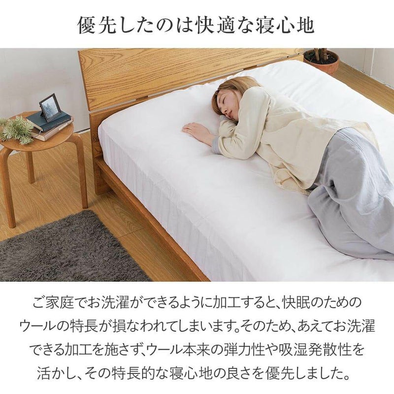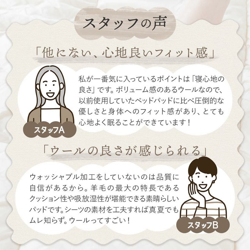 フランス羊毛協会認定の高品質羊毛原料を使用することが条件とされる「レーヌマーク」付のウールパッドです。ウールのカールが強く、弾力のある寝心地をご体感いただけます。
