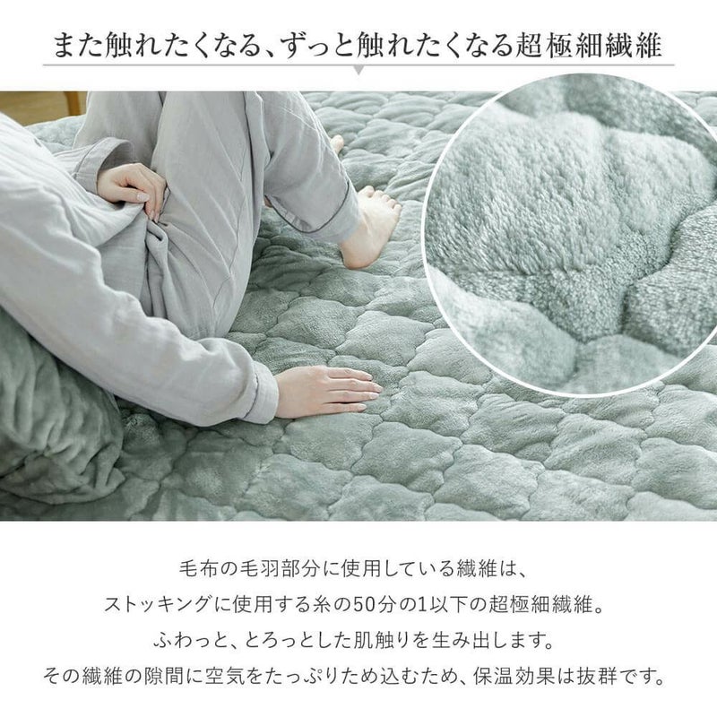 とろけるような極上の肌触りと、驚くほどのなめらかさ。高密度の極細繊維が空気をため込むため、ふんわりあたたかく包みこまれるような心地良さです。表生地と中綿のボリュームをアップする事で、さらに上質な寝心地とあたたかさに。中綿が抗菌防臭仕様なのも、うれしいポイントです。
