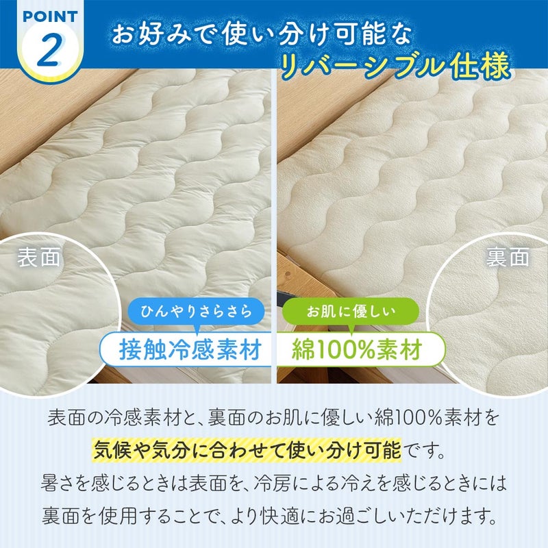 もっちりひんやり気持ちのいい接触冷感と、肌に優しい綿100%の両面仕様敷パッドです。プレミアムタイプは中綿にレーヨンを加えて、1.8倍のボリュームでさらに寝心地UP。
