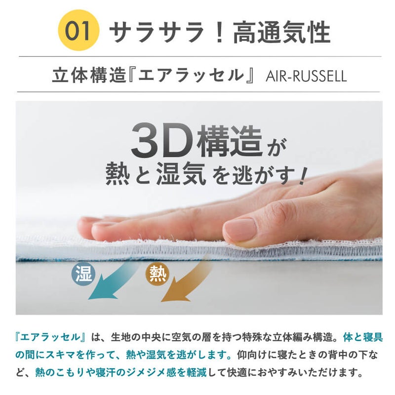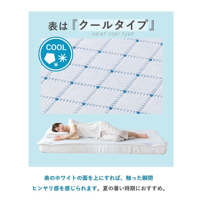 さらっとクールな肌触りの表面と、吸汗・速乾性を追求した裏面の両面タイプ。クッション性にも優れた繊維「ソロテックス」使用し、しなやかな寝心地で上質な睡眠をサポートします。体温調節が難しい赤ちゃんから大人まで幅広い世代でお使いいただけます。お手入れも簡単、春夏秋冬、1年間を通じてご使用いただける高機能パッドは、一度使うと手放せません。