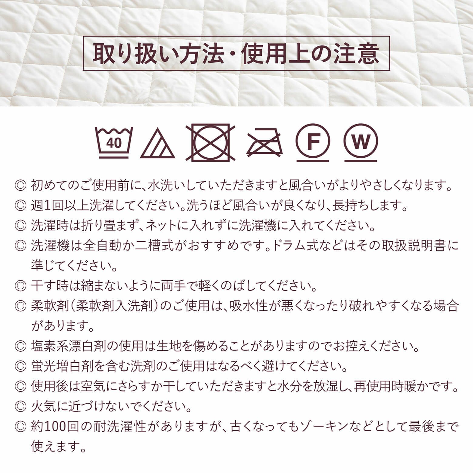 ・洗濯 ~ キルティングが丈夫なので洗濯できます。週1回のお洗濯をおすすめします。