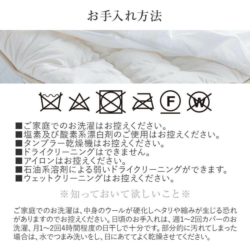 フランス羊毛協会認定の高品質羊毛原料を使用することが条件とされる「レーヌマーク」付のウールパッドです。ウールのカールが強く、弾力のある寝心地をご体感いただけます。