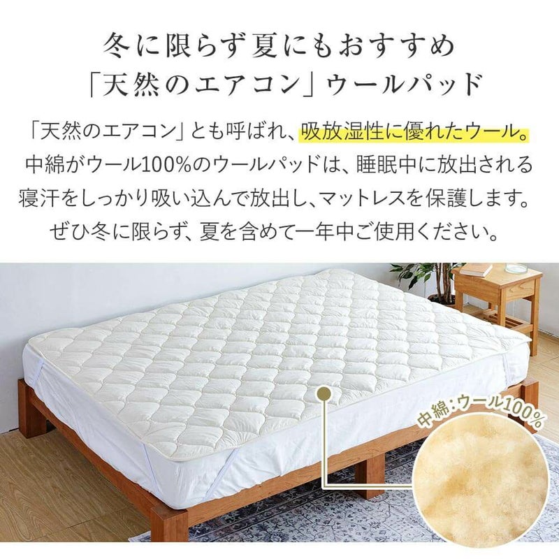 厳選されたウールを使用した国産ウールパッドです。吸湿発散性に優れた天然ウールが寝汗をしっかりと吸い込んで放出し、さらっと快適。年中心地よい寝心地を保ってくれます。