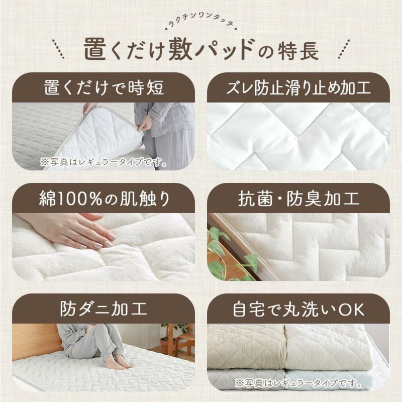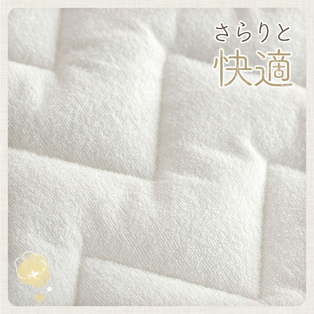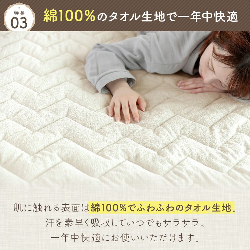 置くだけ簡単、ゴムバンド不要でズレにくい快適な敷パッド。裏面にはシリコン素材の滑り止め加工を施しており、ピタッとフィットして安心。表面は綿素材のタオル生地でサラサラふかふか、1年中快適に使えます。中綿にレーヨンを加える事で吸放湿性能をUPさせ、中綿量を1.6倍に増やす事でさらに寝心地良く仕上げました。