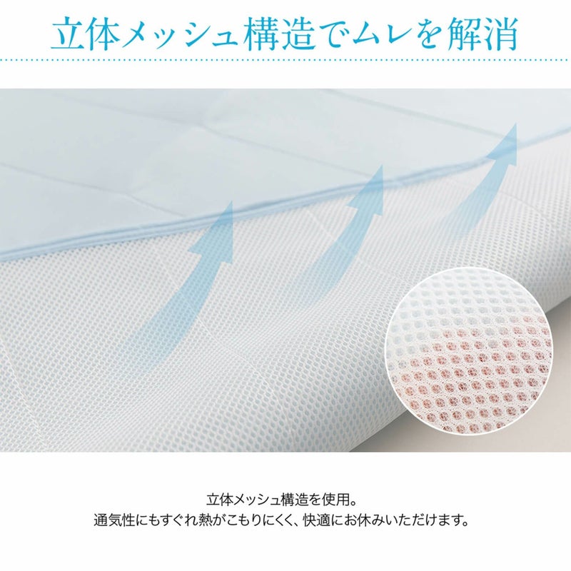 表面に接触冷感生地を使用、裏面には立体メッシュ構造を使用した通気性に優れたパッドです。寝返りする度ににひんやり気持ちよく、一晩中ぐっすり。
