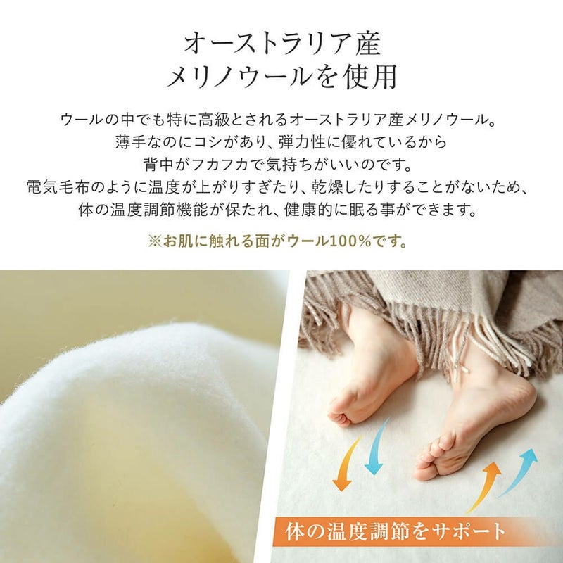 オーストラリア産メリノウールを使用し、和歌山県の毛布工場で生産したパッドシーツです。フカフカと優しい肌触り。