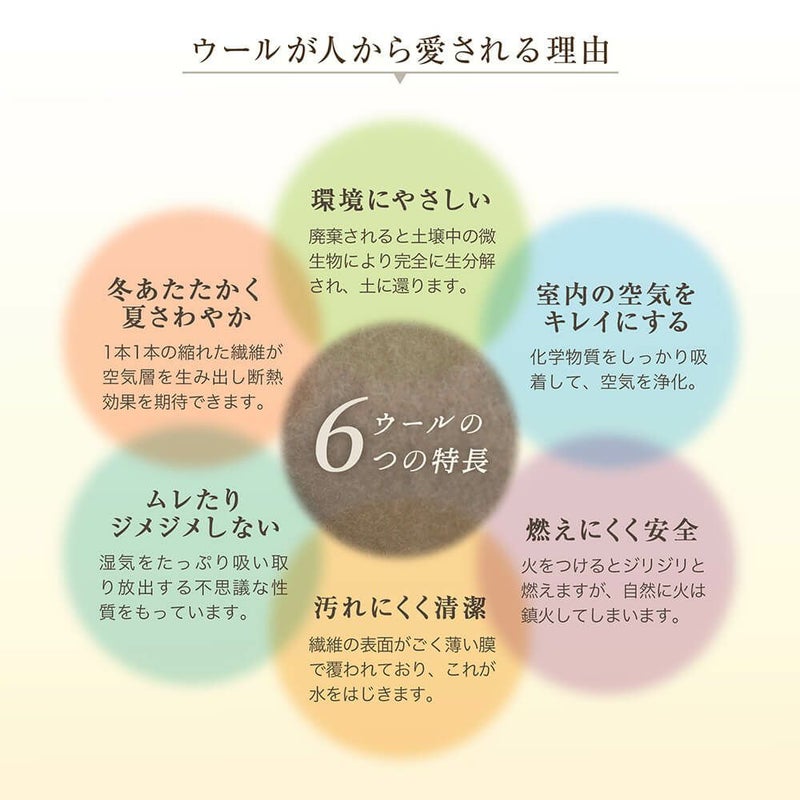 天然の調湿機能を持つウールは、温度、湿度ともに素早く快適な環境に整え、まさに「天然のエアコン」。 背中側の敷きものにウール素材を使うことで、暖かいだけでなく体圧を分散し快適に眠る事ができます。