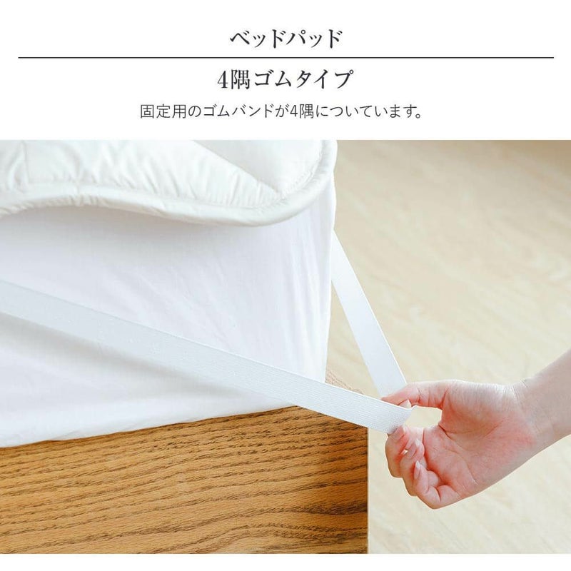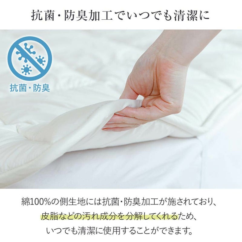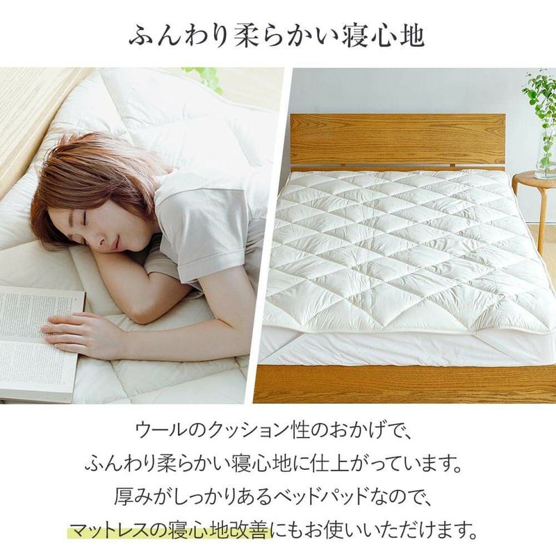通気性と弾力性に優れたウール100%のベッドパッドです(側地は綿100%)。吸湿性、放湿性もよく洗濯も可能。側地には抗菌・防臭加工が施されており、衛生的で清潔にご使用いただけます。四隅にズレ防止のゴムストッパー付。