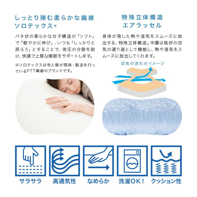 吸汗・速乾性を追求した「サラフパッド ドライホワイト」。特殊立体構造のエアラッセルが高通気性を実現!いつもサラサラで快適な寝床環境を保ってくれます。クッション性にも優れた繊維「ソロテックス」使用で体圧分散を助け、上質な睡眠をサポートします。体温調節が難しい赤ちゃんから大人まで幅広い世代でお使いいただけます。春夏秋冬、1年間を通じてご使用いただけるサラフパッドをぜひ体感してみてください。