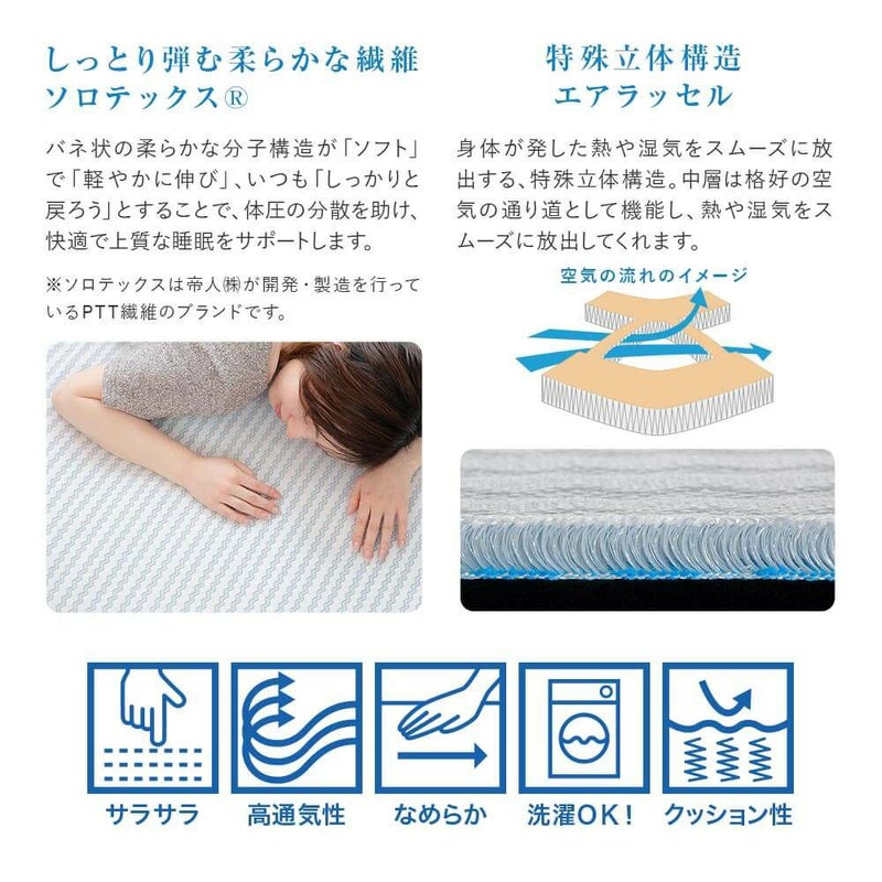 「高通気性」と「サラッとクールな肌触り」を備えた立体構造の【Salaf】サラフベッドパッドです。表面は滑らに編み立ててあるので、直接お肌に触れてご使用いただけます。夏の快眠は【Salaf】サラフにお任せ!