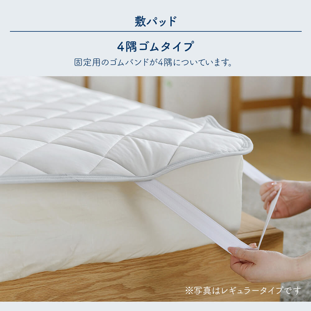 マットレスにベッドパッドを敷き、ズレ防止用の4隅のゴムをマットレスに引っ掛けます。
