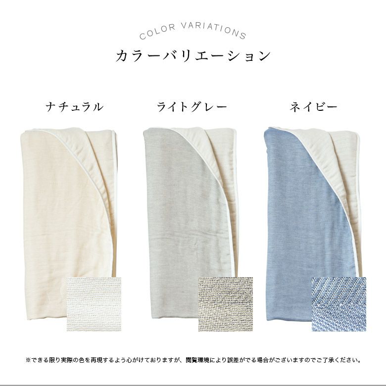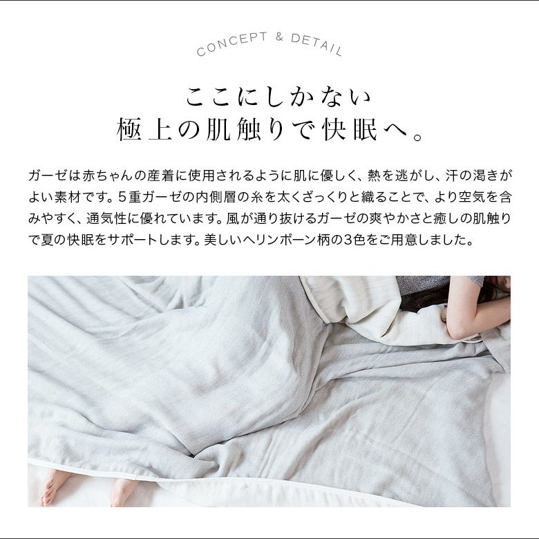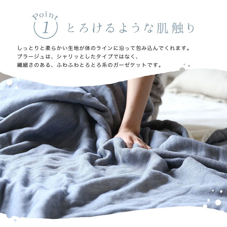清涼感漂う3色の色合いにヘリンボーン柄がアクセント。夏は涼しく、冬はあったか、オールシーズン大活躍!糸選び、生地の組織を工夫したからこそ実現した、とろけるような肌触り。使うたびにやわらかく、ふわふわと、肌に馴染んでいきます。ソファカバーやベッドカバーとしてのご利用もお勧めです。