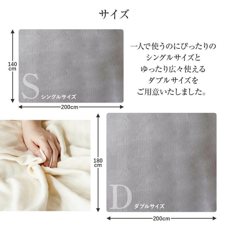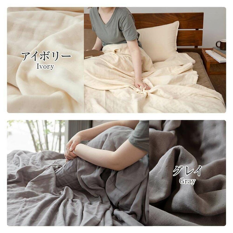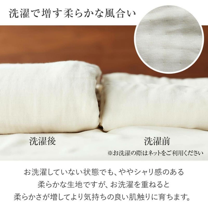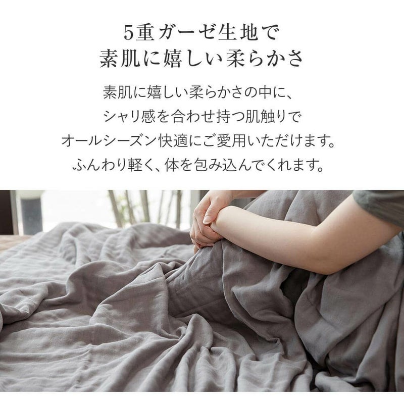 ガーゼを5重に重ねることで空気の層ができ、軽やかなのにふんわりとボリュームのある仕上りに。やわらかさの中に、さらっとしたシャリ感を合わせ持つ肌触りです。お洗濯を重ねるとふんわり感が増していきます。お肌にやさしい綿100%素材で、オールシーズン快適にご愛用いただけます。