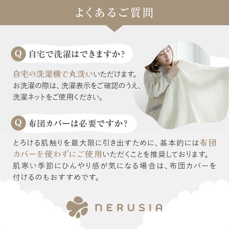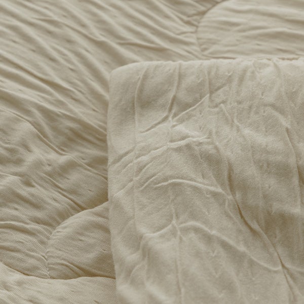 特殊加工した生地と、こだわりの中綿の組み合わせにより、驚くほど柔らかい質感を実現しました。まるでメレンゲに包まれるような感覚、あまりの心地良さで手放すことができなくなります。プレミアムタイプは生地に椿オイル加工をして、さらにとろりと気持ち良く仕上げました。