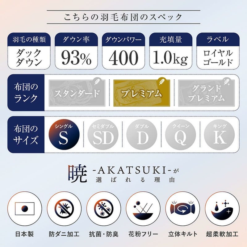 日本羽毛製品協同組合が定める「ロイヤルゴールドラベル」を取得した、当店オリジナルの国産合掛け羽毛布団です。防臭、抗菌加工を施しており、安心安全にご使用いただけます。